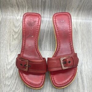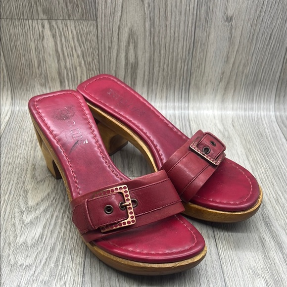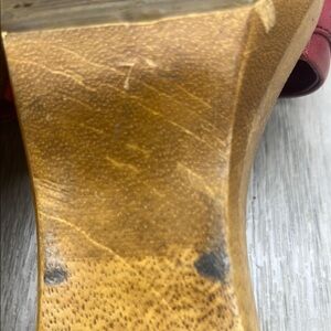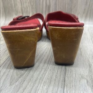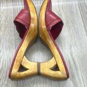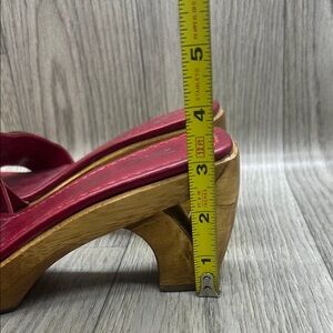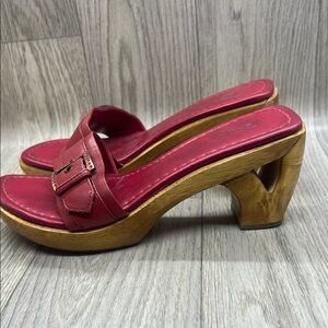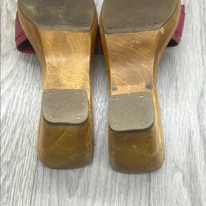 Pre owned Red Leather Upper Mule Carved Wooden Heel Cha Cha Clogs Step into sophistication with Two Lips' red sandals, designed with a sleek ankle strap and a high heel for an elegant silhouette. These sandals boast a glossy finish, adding a touch of luxury to any formal occasion. Crafted with attention to detail, they offer both style and comfort for your special events. used shoes can include signs of wear such as scuffs and scratches, dust and creases from normal use, Dirt, stain or damage will be shown in photos. see all pictures as they are part of the of the description.
