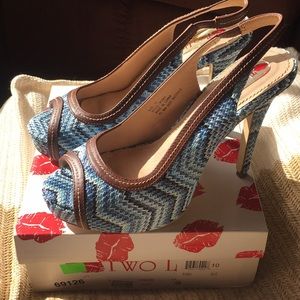 NWT woven style pumps. Beautiful blues and brown trim. Two Lips, size 10