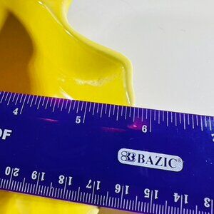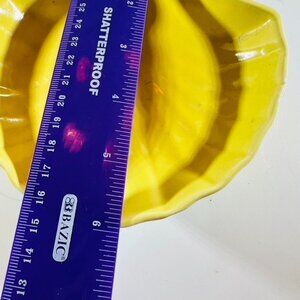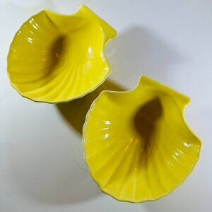 Two Little bright yellow clam shell dishes, sushi, sauces, kitty food.