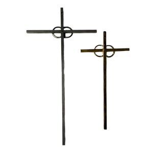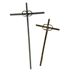 Two Metal Crucifix Religious Crosses are vintage pieces made of stainless steel with gold and silver tones. Perfect for any religious setting or as a thoughtful gift.