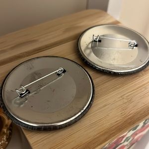 Two round buttons from the Broadway musical Spamalot.