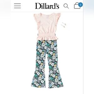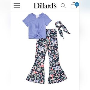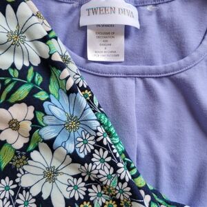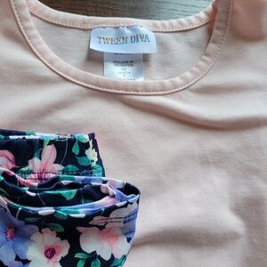 Two outfits. Blue cropped top with twist detail on front with coordinating floral flared pants. Pink shirt with elastic on waist and ruffled sleeves with coordinating flared pants. Tween Diva Size 8. See all pictures as part of the description.