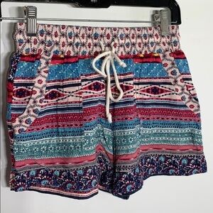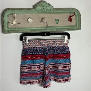 This listing is for a bundle of two women’s size extra small bohemian shorts. One pair of XS Hollister elastic waist paisley print shorts with pom-pom trim bottom and string tie front / waist f/l 12.5” ustretched / length 12” One pair lily white extra small drawstring elastic waist mixed print southwestern BoHo style mini short with pocket / f/l waist 12” unstretched / length 12” Both are preowned good condition no holes or stains Classic free people summer style / trendy 115/ZB