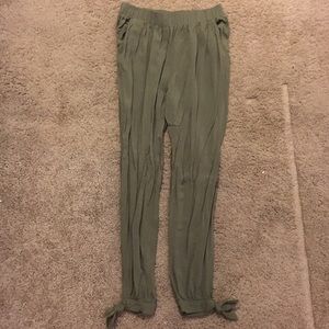 One multi-colored pair and one olive green pair. Both have pockets and are super comfortable. Come together! Both size small
