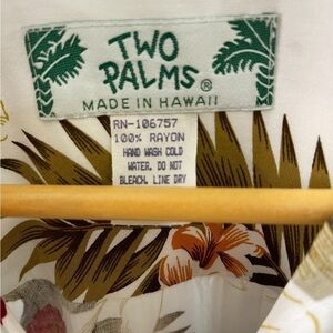 Two Palms Mens Size M 100% Rayon Made in Hawaii White Orchid Printed Shirt. Nice and Clean Shirt. Has white orchids and leaves print on shirt.