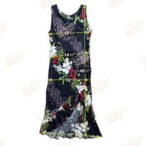 Slight discoloration on floral print. Measurements: Bust = 15.5 inches, Waist = 14.75 inches, Hip = 15 inches, Length = 48.25 inches, Hem width = 22 inches.