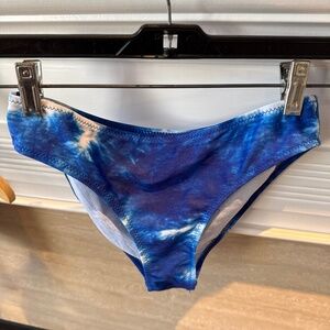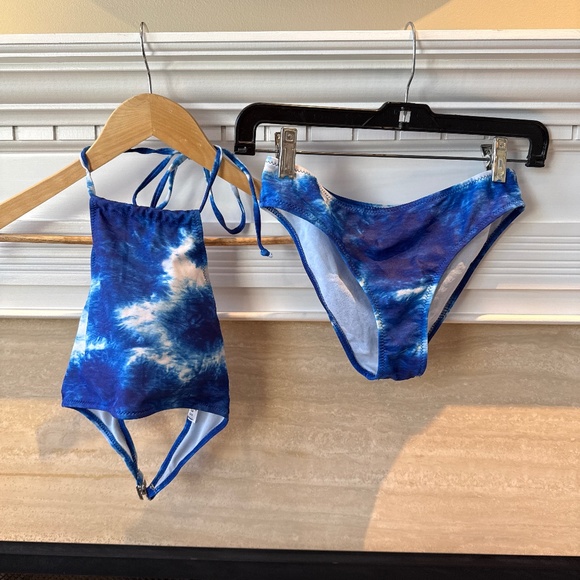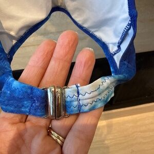 Blue and white two piece bathing suit. Top is a halter style top with tie and clasp closures. Bottoms are bikini style with full coverage. Some pilling on seat of bottoms.