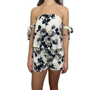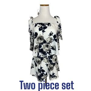 Beautiful two piece short set. The top has a zipper and is strapless with ties that can be tied around the shoulder. The bottom is also zippered and has built-in shorts. Wears more like a two piece romper. Outfit is very cute on! Model is 5'10" and 135 lbs for reference.
