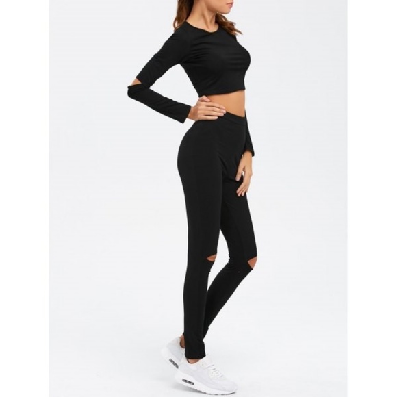Matching legging and crop top set with cutouts in the knees and elbows, perfect work working out or hanging out. Fits a size small.