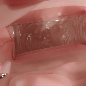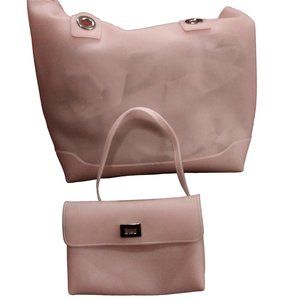 A Pale Pink Translucent Vinyl Bag is listed for sale with a small detachable purse. (Two Piece Bag Set). The Tote features a Top Handle with magnetic closure but no interior pockets. The Small purse is detachable and can be carried separately or attached to the Interior (to use as a Pocket for Cosmetics, Bills, Change, etc.) or to the Exterior of the Tote. This fun Set is in excellent condition.