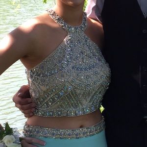 Gorgeous mint/aqua two piece prom dress. Purchased online from PromGirl. The top is beaded with mesh on the back. The bottom is jersey material that is stretchy and therefore can larger or smaller sizes. Dress was not altered at all! Some snags on the inside of the dress from the beading on my shoes but it is not noticeable at all. Size 6 but fit a little big on me. I am 5'5 wearing 4 inch heels.