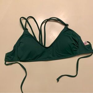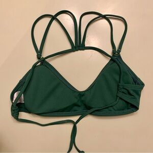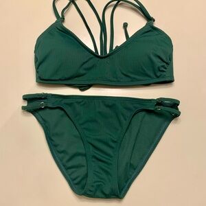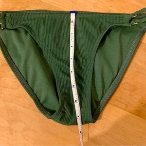 Two piece dark olive/army green ribbed bikini. Top has removable padding and cage straps on back, straps are adjustable to adjust width and rise of bikini top. Matching ribbed bottoms with cage strips at hips and gold hardware. Really cute bikini set! No piling, rips, stains, in great condition! Bottoms measure 12” flat across