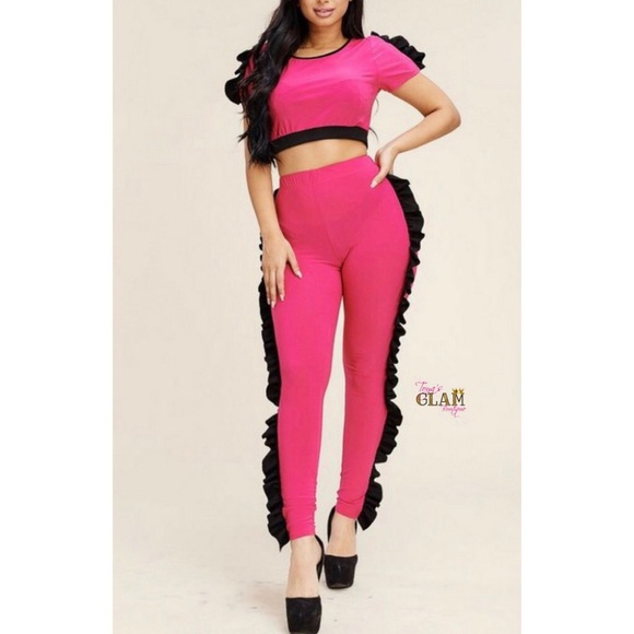 Short Sleeve Crop Top And Leggings Two Piece Pink Ruffle Set. Material Is 92% Polyester And 8% Spandex. True To Size