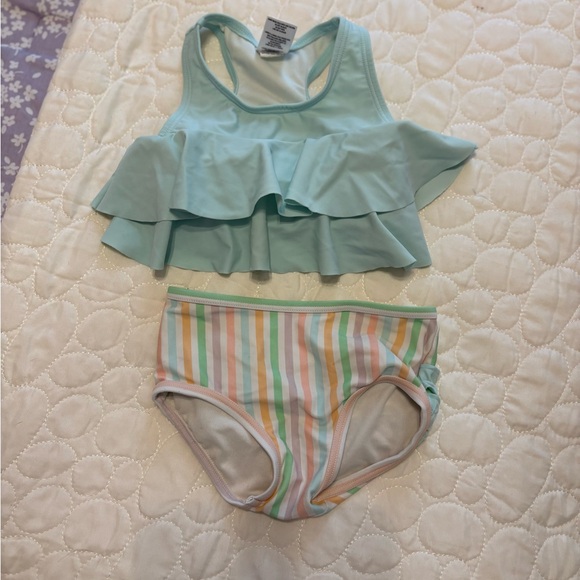 Two-piece rufflebutt swimsuit set. Mint green ruffle tankini top with layered flounce with vertical pastel stripes in mint, peach, yellow, and pink bottoms. Playful, beach-ready look.