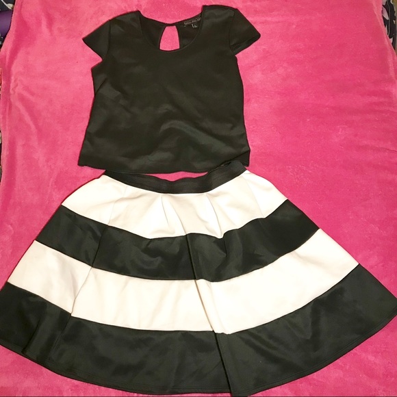 Black and white shirt and skirt combo. Shirt with keyhole in the back