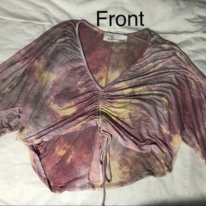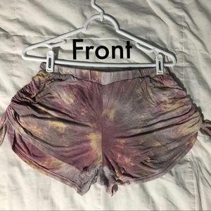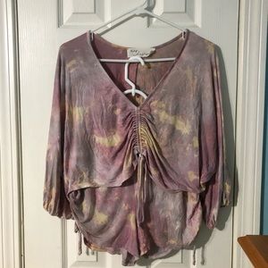 Light-wash pastel tie dye two piece set with adjustable drawstring ties on the top and bottom.