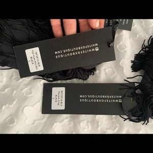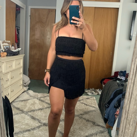 Two piece black fringe skirt set. New with tags from White Fox Boutique. Both sizes small. Top was 60$ bottom was 75$
