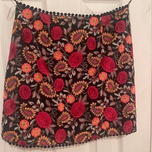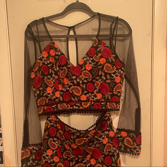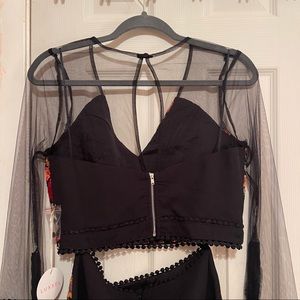 Two piece set with skirt. The top has a zipper on the back as well as on the sleeves with mesh detailing.