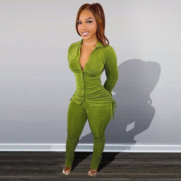 Two piece set with adjustable drawstring on the sides! Material is cotton. Quality is great