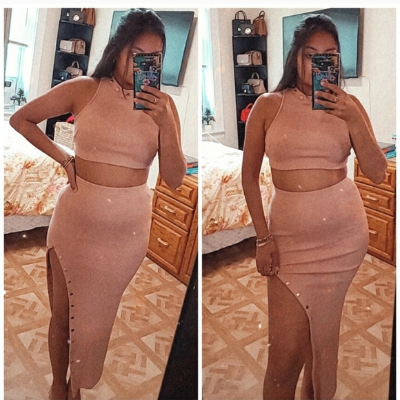 Super cute 2 piece never worn other than trying on. Kim K inspired set. Bought it for my birthday never ended up wearing it. The color is a soft pink nude