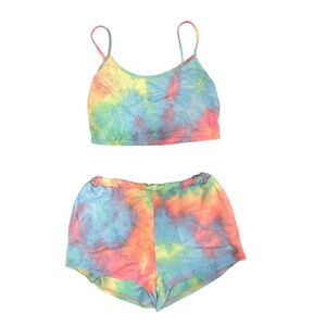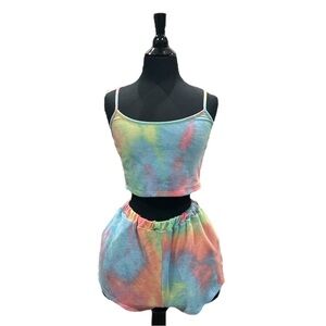 Two piece tie dye shorts set, used and worn a few times. Good condition plenty of life left! The elastic waist band is in great shape. Item is a lil faded from washing but looks cool and trendy still! The shorts are suppose to fit like booty shorts and top is a crop top tank top, size is Small/Medium.