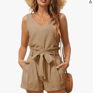 DESIGN: 2 piece outfits jumpsuit, short romper set for women, women's paper bag waist cropped short pants with casual wide leg pants, casual trousers and summer tank top, elastic ruched waist makes it is easy to pull on, loose fit style romper with high elastic waist, belted pants with pockets, front v neck and back v neck wide strap tank top