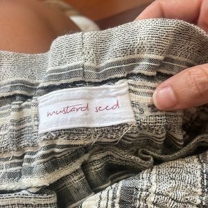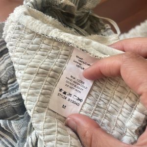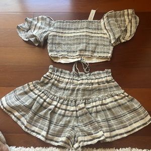 Two Piece grey/black and cream striped set; lacing in middle of top with ruffle sleeves; bottoms are shorts with tie in front middle; top is size M and bottoms are size S; top is new with tags and bottoms never worn