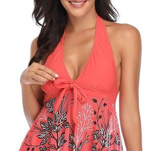 Halter tankini top with push up bra for better support; Unique color pattern make this tankini swimsuit more stylish; The asymmetrical front ruffles hide what you want hidden on top, and still looks fashionable;