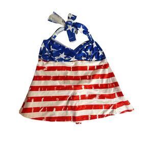 • The halter-style top ties at the neck with a bold blue and white star-print strap, adding a festive American flag touch. A back tie closure and open-back design provide a flattering, adjustable fit, while the flowy tankini top adds coverage with flair