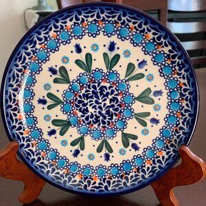 This is a set of two preowned Polish Pottery "Blue Tulip Garden" 7" Plates by Ceramika Bona Boleslawiec. They are in excellent condition. They are Unikat which means Unique in Polish and requires more skill to create due to the complex patterns.