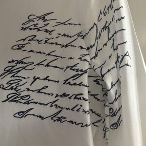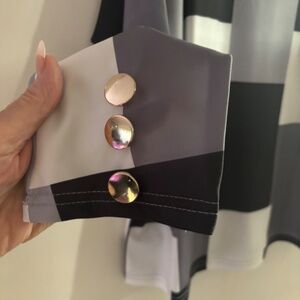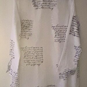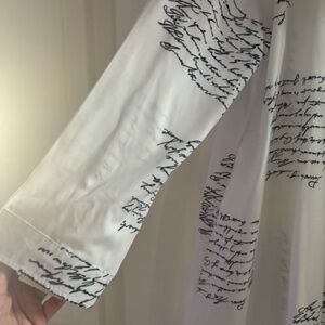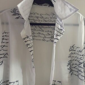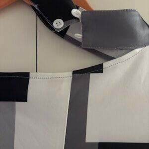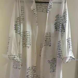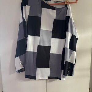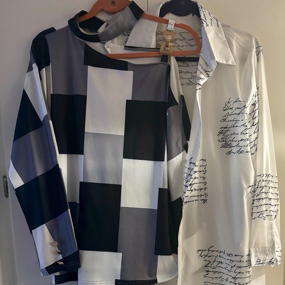 Both of these 100% Polyester tops are XL (approximately size 12)…….New from SHEIN ( I Ordered the wrong size & had to reorder)..The black, silver & white one shoulder top is amazing on and very flattering. It has great gold detail on the sleeves & shoulder…and can be worn with a bra as the shoulder gold detail fits perfect. The elastic for the buttons on the back of the neck band can b a little difficult to button at first until it’s been done a few times…though polyester, it has a sheen to the fabric & a silky feel. The white print top would be great as an open front topper over tights or a slim jean or pants. It is very versatile and it could also be worn as a button down shirt dress. Even though polyester it has the feel of a nice cotton/poly blend. Both pieces are new and I liked them well enough to reorder in my size.