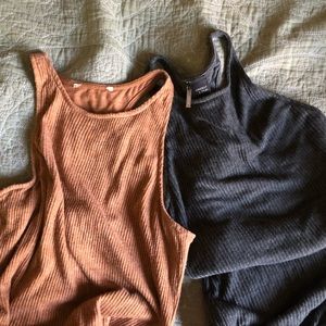 Super cute ribbed dresses the grey is a size small and i believe the tan is a medium they both have good stretch! the grey is sparkle and fade, the tan is from forever21 i cut the tag out because it was itchy 😖