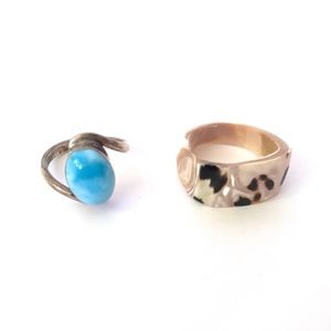 Set of two rings giving some major seaside boho vacay vibes. One is Larimar and sterling silver (stamped 925) approx size 5.75. It has the main stone and then a swirl sterling silver band. The other is a ring made from a seashell. It’s been polished and is very opalescent with a kinda leopard/tortoise natural pattern.