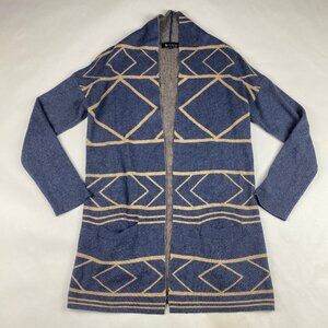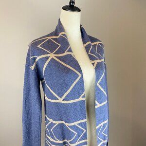 Open front cardigan features geometric aztec print in blue and cream colors. Viscose/Polyester/Nylon/Angora fabric blend.