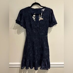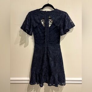 lace dress, navy lace, flutter sleeves, mini dress, ruffle hem, fit and flare, v-neck dress, occasion dress, cocktail dress, party dress, wedding guest dress, formal dress, feminine style, romantic aesthetic, elegant chic, evening wear, date night outfit, floral lace, scalloped hem, back lace-up detail, trendy boutique style, classy style, semi-formal dress, navy aesthetic