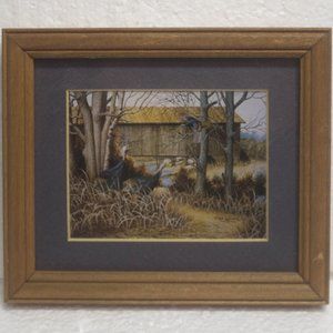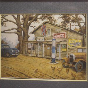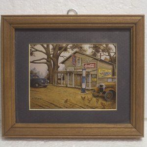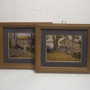 This is an offering for two small framed prints by Alabama Artist John Zed King. One print is of an old country store called Bubba's Place.It features a flavor of the old south. The other is a print of wild turkeys next an old barn with one turkey flying. The frames on these prints are about a 5.5 x 6.5 inches. The prints in the frames are about 3 x 4 inches. These prints are nicely matted. The frame on the turkey print does show some damage to the wood. Please see images for more detail.