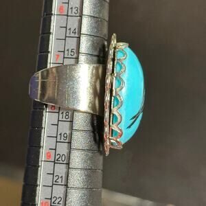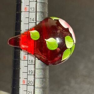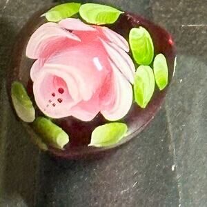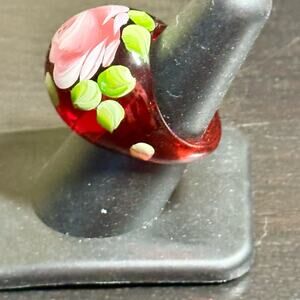Two costume jewelry rings, one featuring a lovely blue background and a black bird with adjustable sizing and the other is a size 7.5 or so red acrylic ring with a pretty pink rose painted on it.