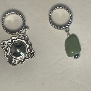 These two charms/pendants feature one ornate sterling silver charm stamped S925 on the back and one green stone charm. They both have large round ornate connectors that would fit in a very large chain. Excellent vintage condition