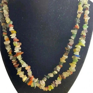 Two handmade gemstone necklaces that are 19” long. Turquoise,onyx,lapis,coral,rose quartz,moonstone and citrine to name a few.