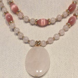 Two Strands Rose Quartz And Pink Tiger Eye Necklace With Rose Quartz Drop