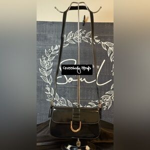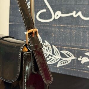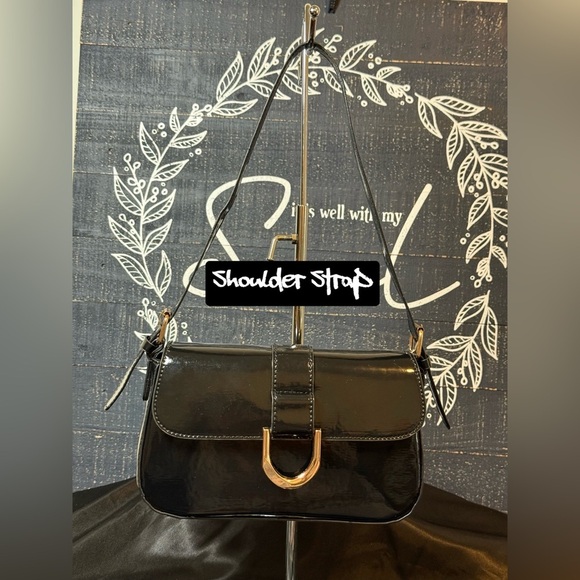 This chic black patent leather handbag is perfect for any occasion. Its sleek design and glossy finish make it a stylish accessory. The gold-tone hardware adds a touch of luxury.