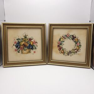 Two Theorem paintings. These are Hand Painted by Maura Campbell of Hingham MA. Well known for her Theorem art. See write up on back of these 7x7 Framed wall hangings, as seen in photos. Estimating finished works size as 6x6 if removed from the frame, but I have not done that.