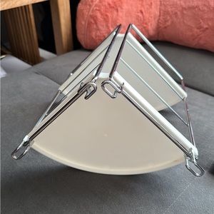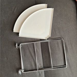 Two tier silver and white corner storage shelf. From bed bath & beyond, made from durable plastic. No flaws.