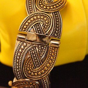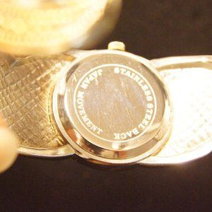 Beautiful design. Two tone bracelet design with hinges so you can easily put it on your wrist. Watch has a fairly recent battery.