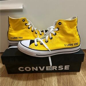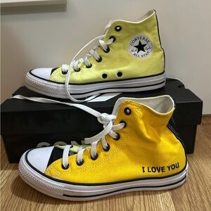 The custom hightop Converse were made with love. They are a neon yellow on the inside panels with black accents and a nice toned down yellow on the outside panels and are customized with the words “i love you” right next to the heel. They are truly one of a kind!