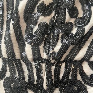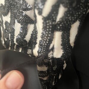 Geaorgeous evening gown. Cream with black sequins, and cross grain sash. Back zip, with just the right amount of stretch. Worn once! Excellent condition with very minor flaws - pictured.