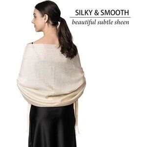 Blend of silk, fine viscose and acrylic. Soft silky feel fabric. Dimensions: APPROX. 28"W x 78"L including fringes (3" fringe tassels on each end). Weight: 6 oz.