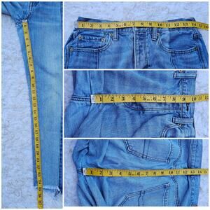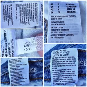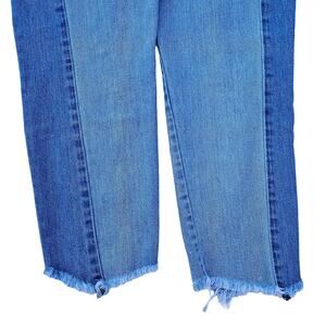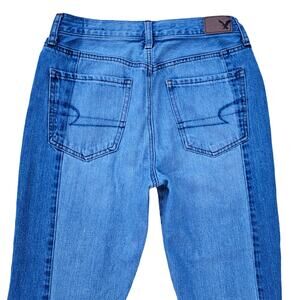 100% cotton denim in a Two Tone light and medium wash colorblock design. 5 pocket, button fly, high rise waist, vintage silhouette, cropped ankle length w/ raw edge asymmetrical hems. Very good preowned condition. Size 6 Regular by American Eagle Outfitters. Style: Vintage Hi-rise