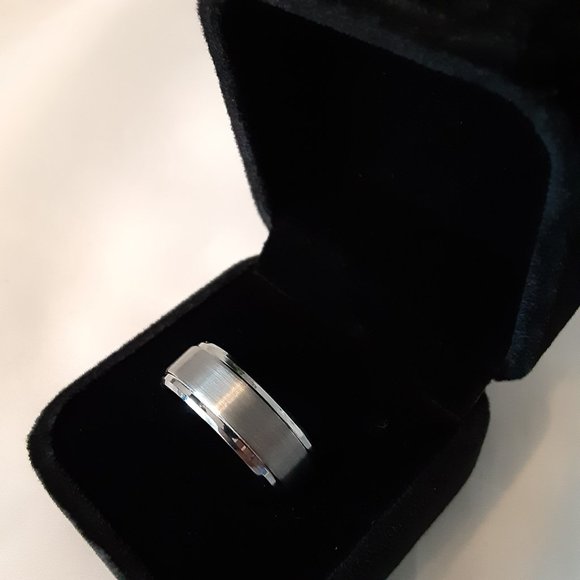 @foursouls Hi there, so the center is matte silver, looks like a brushed steel.. it has like micro lines. It's really very nice and looks brand new. I bought it at a jewelry store liquidation auction. I've added a few more pics, one showing the Tungsten Carbide engraving and one on the size 11 circle.
