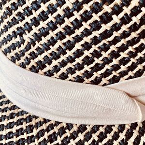 Black and ivory seagrass straw weaved with a round pork pie crown stiff wide brim summer straw sun hat! A summer boater hat with wide tailored tucked ivory band, lightweight, breathable style for festival, concerts, vacation, and other occasions! Great summer hat for men or women! Contemporary, Y2K, to chic Boho style!